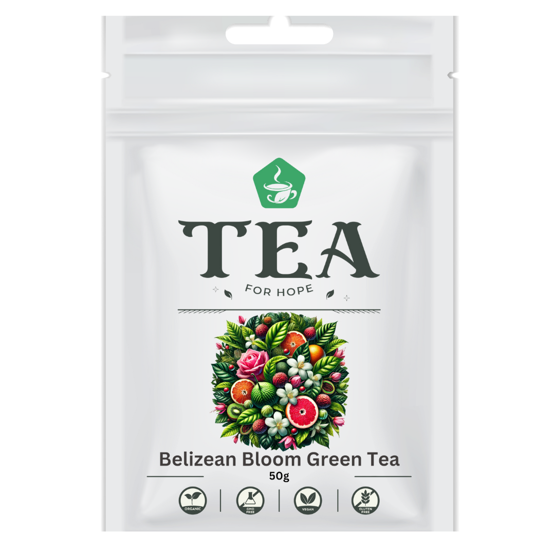 Belizean Bloom, our exquisite new green tea that transports you to a lush garden in Belize. Featuring a vibrant green tea base, this delightful blend showcases enchanting notes of jasmine and rose, perfectly balanced with the tropical sweetness of lychee and the refreshing zest of grapefruit and delicate peach.